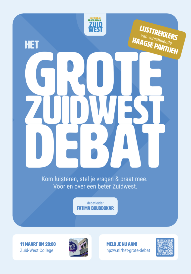 Op woensdagavond 11 maart vindt het grote Zuidwest debat plaats. Een belangrijk politiek debat in het kader van de aankomende gemeenteraadsverkiezingen. Lijstrekkers van Haagse partijen gaan op deze avond met elkaar in gesprek over belangrijke thema’s die in Zuidwest spelen; zoals armoede, onderwijs, gezondheid, wonen, economie, leefomgeving, werk en veiligheid.