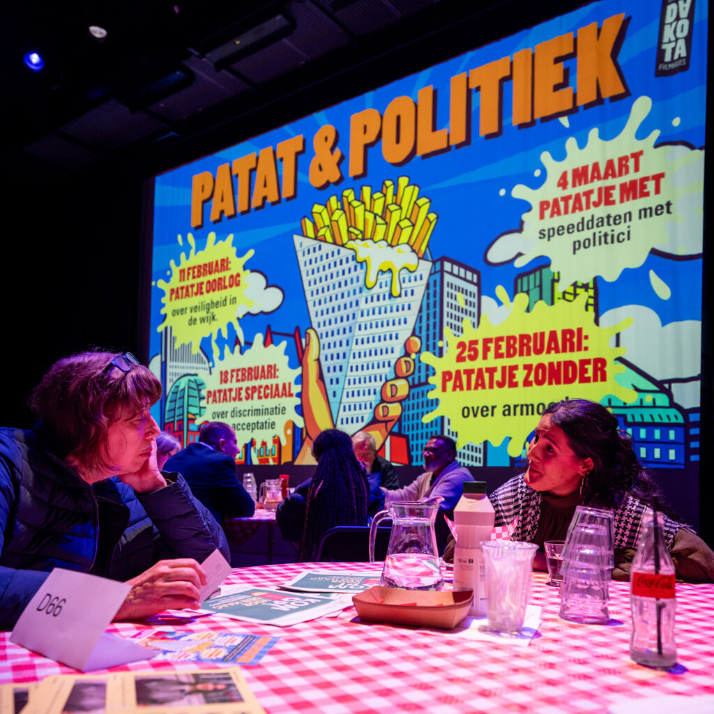 In Den Haag Zuidwest is de opkomst bij verkiezingen vaak laag. Daarom werd in Theater & Filmhuis Dakota de serie Patat & Politiek georganiseerd: eerst een patatje, daarna het gesprek. De bijeenkomsten werden ondersteund vanuit de alliantie Sociale Samenhang & Participatie (SS&P).