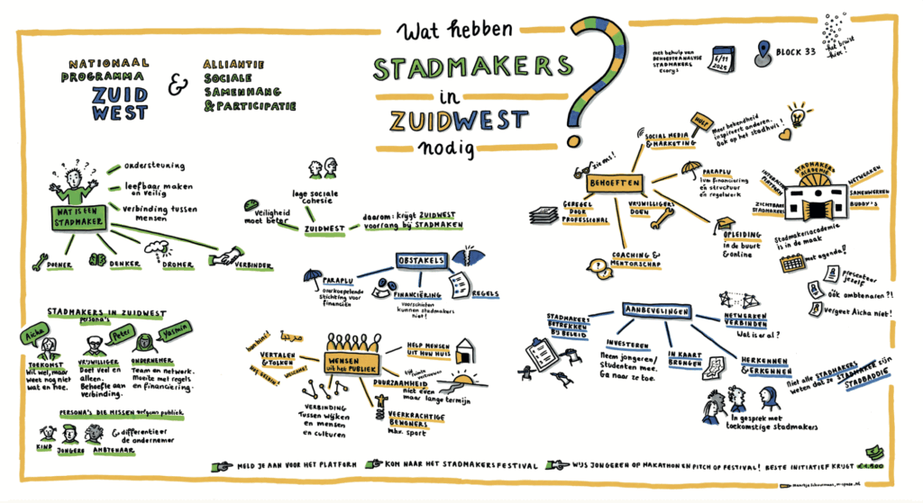 De inzichten uit dit onderzoek zijn besproken met stadmakers, organisaties en betrokken partners. Samen verkenden zij welke vervolgstappen nodig zijn om stadmaken in Zuidwest te versterken en toegankelijk te houden voor iedereen die iets wil bijdragen aan de wijk.